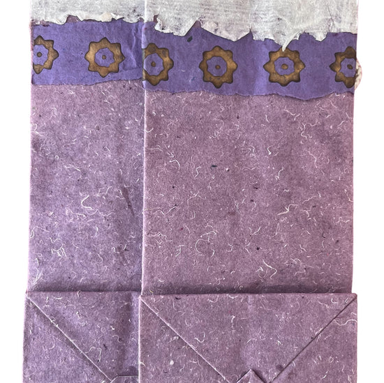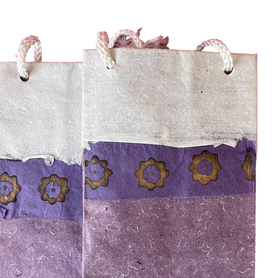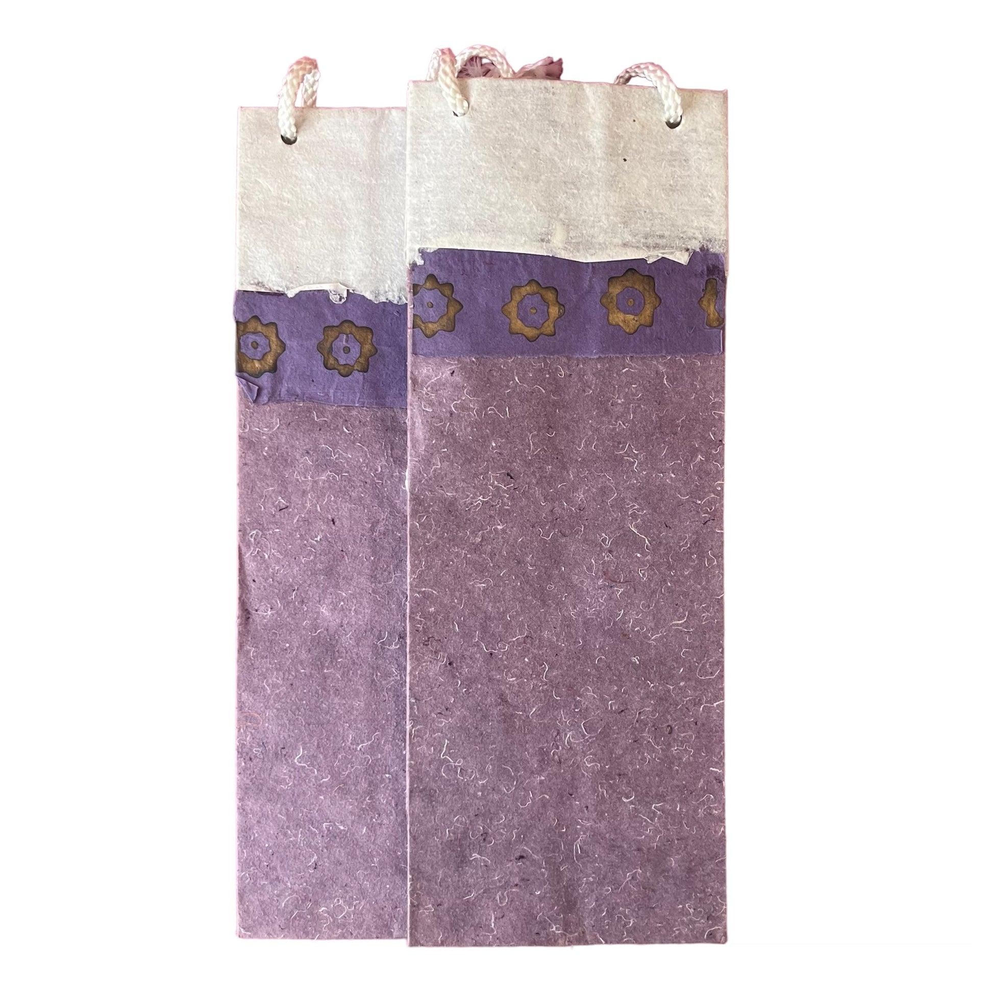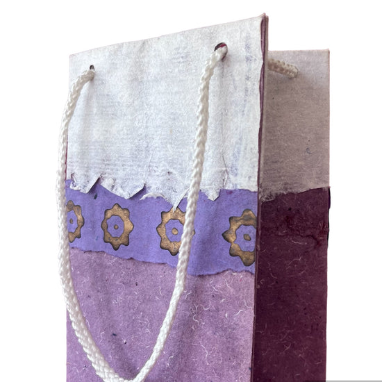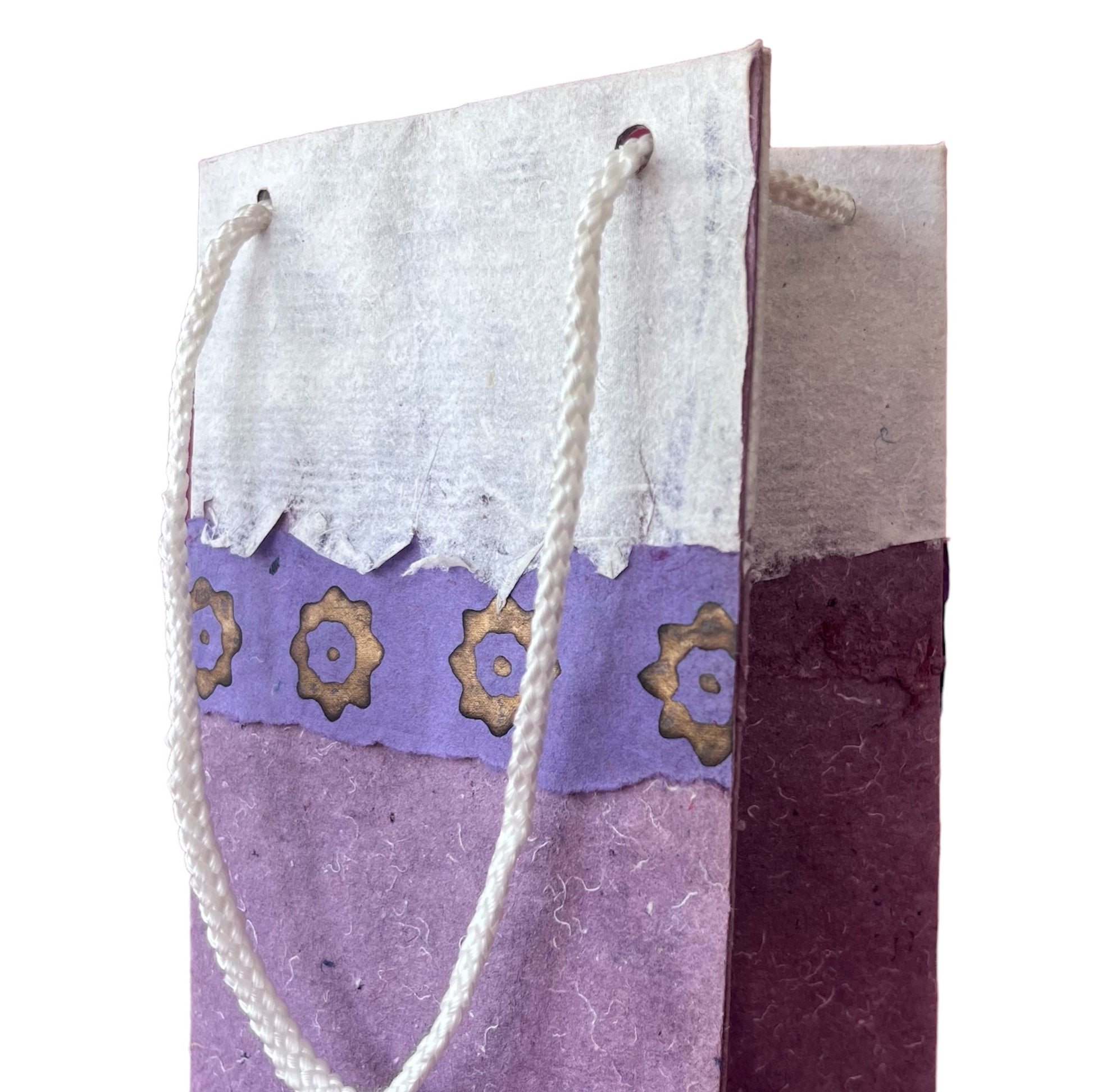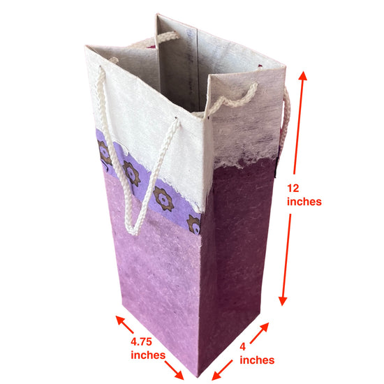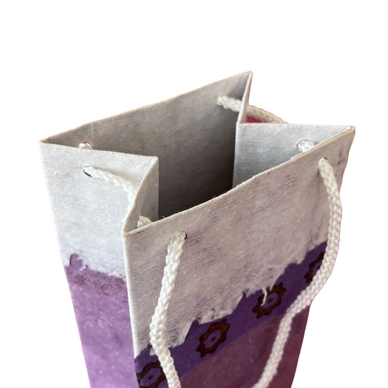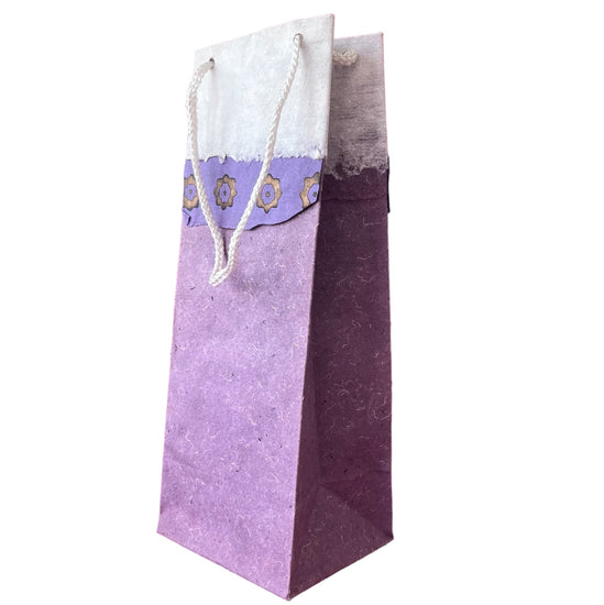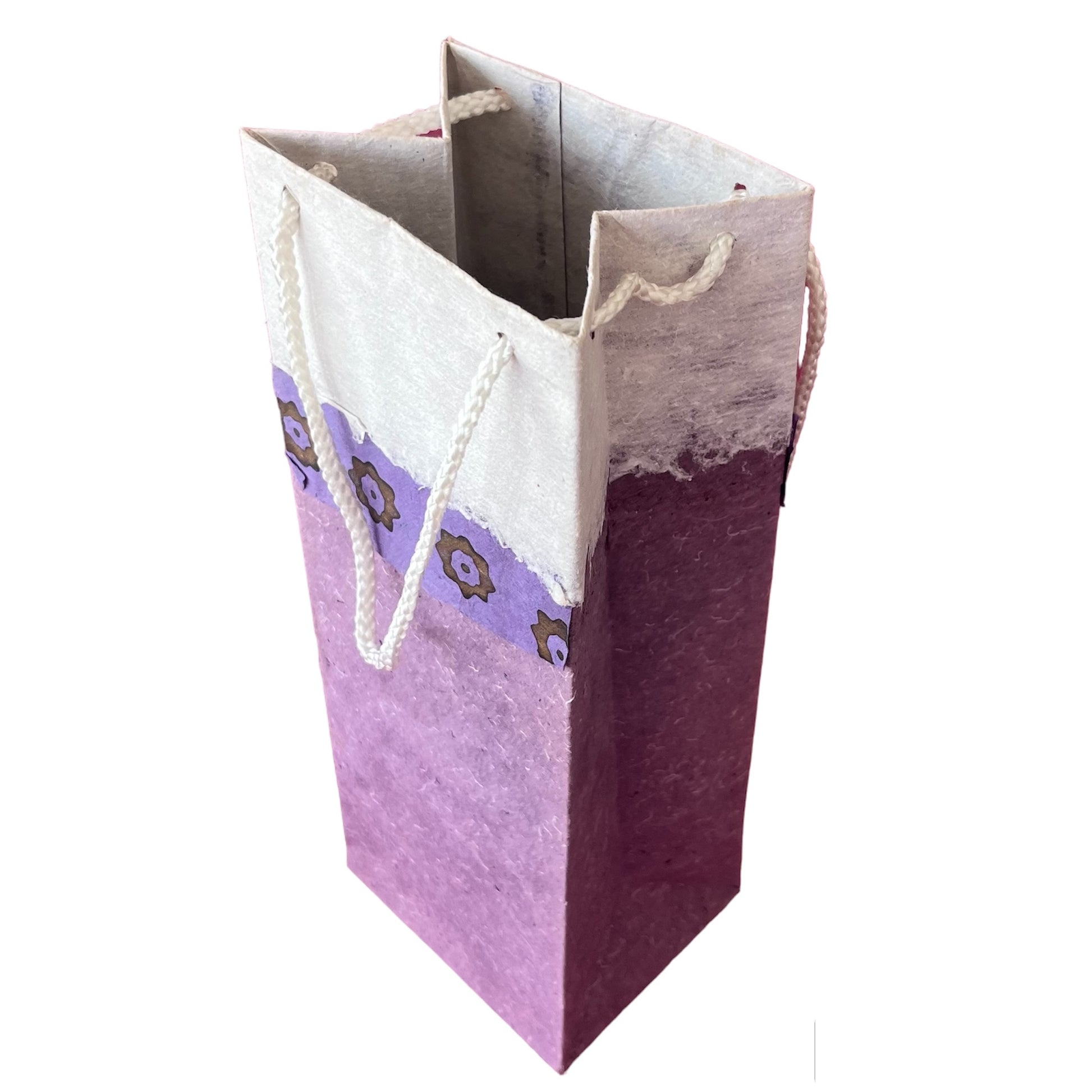 This paper bag made from a strong double sheet of hand lifted paper is designed especially to carry a bottle of wine or champagne. The intertwined thread handle was made for greater strength and durability.