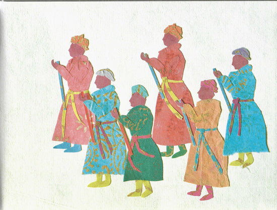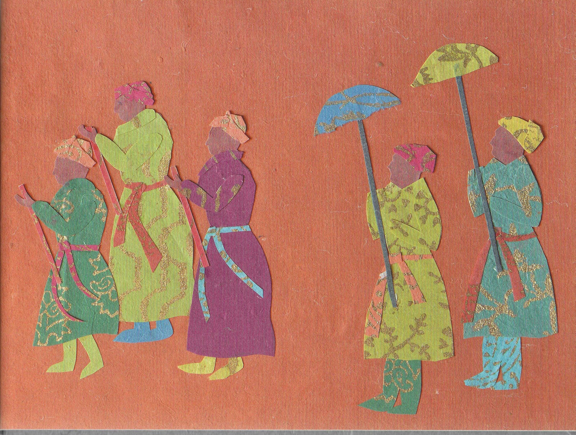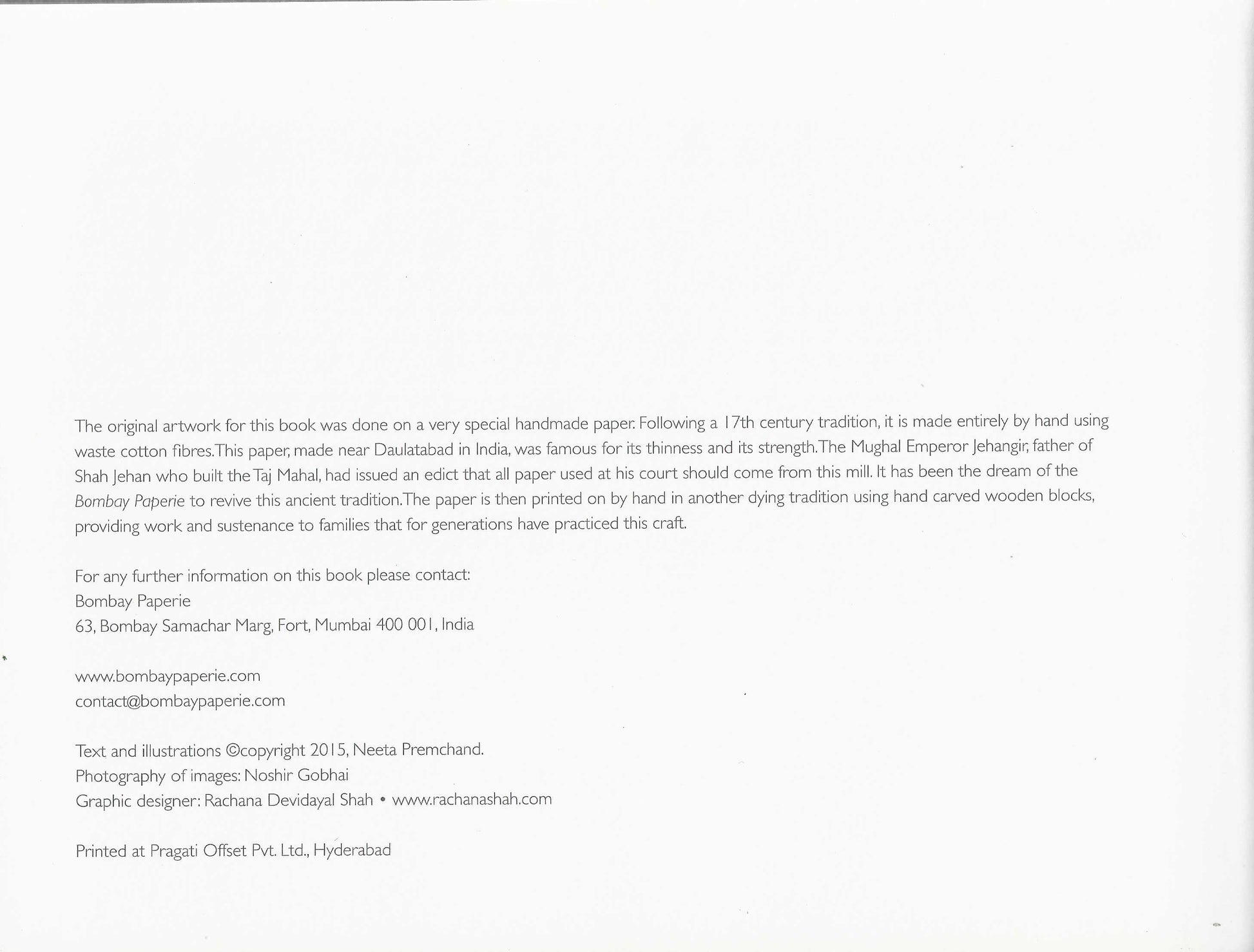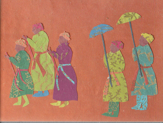 The paper used in all the collages is made by hand in Daulatabad, following a 17th century tradition. It is block printed in Ahmedabad, following another fast disappearing tradition, using hand-carved wooden blocks.