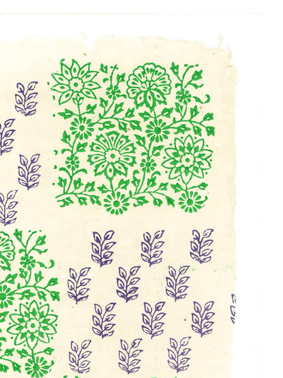 Two square wood blocks printed in contrasting purple and green stand out on our beige / white paper.