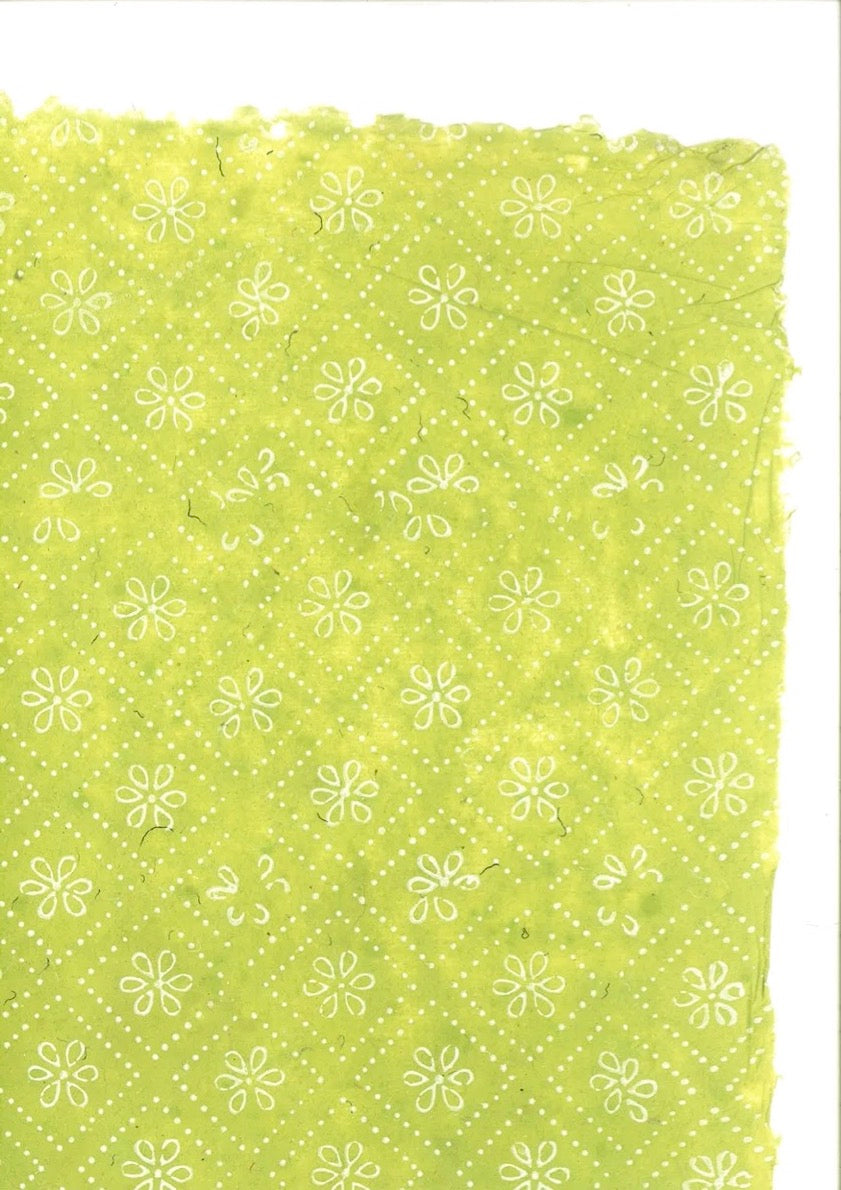 A repetitive floral motif in a dotted square, on lime green paper, is ideal for wrapping a gift.
