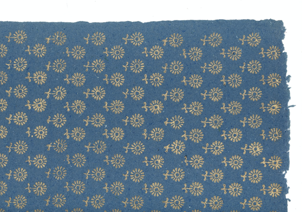 A single block printed in gold, of a floral motif has a mesmerising effect. It is an ideal wrapping paper for the festive season.