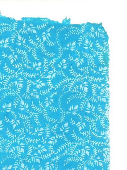 A twirling pattern of leaves, creating an endless feel on a soothing blue paper.