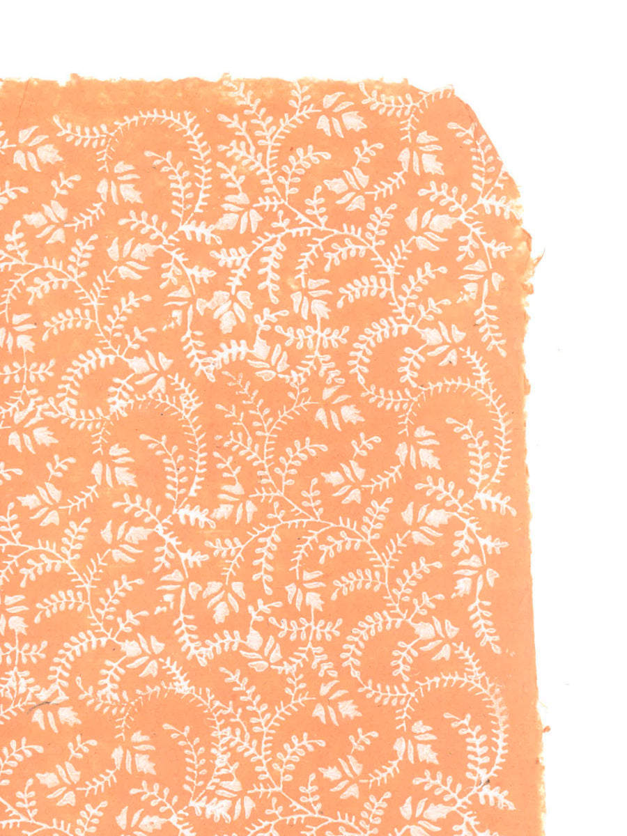 A twirling pattern of leaves, creating an endless feel on a carrot orange paper.