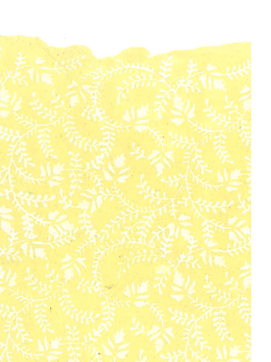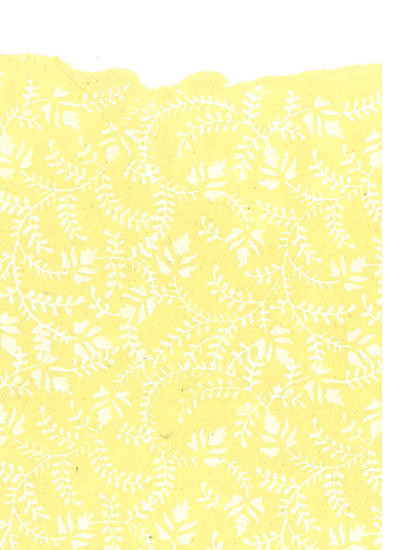 A twirling pattern of leaves, creating an endless feel on a lemon yellow paper.