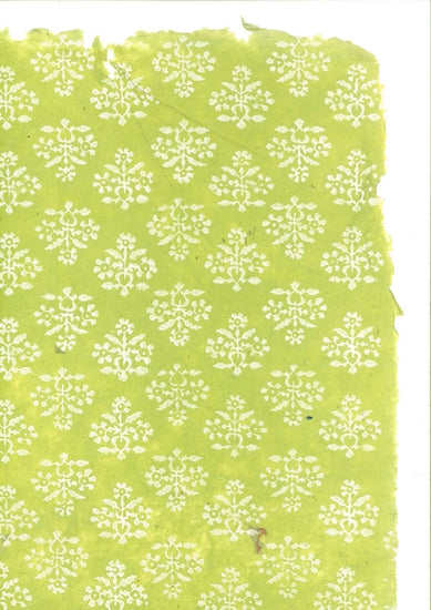 A single white floral crest on a chartreuse green paper, is ideal for wrapping a gift.