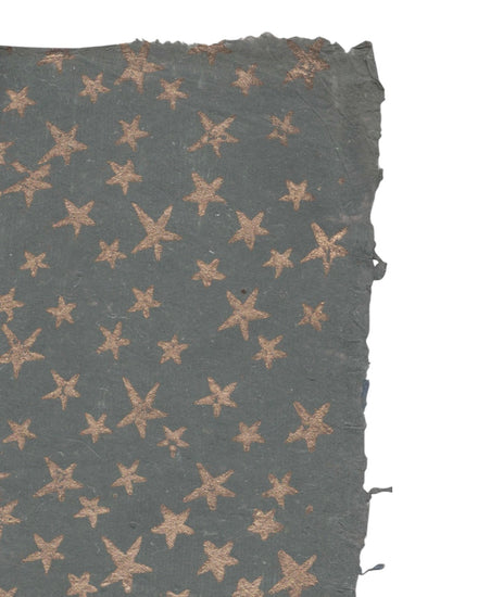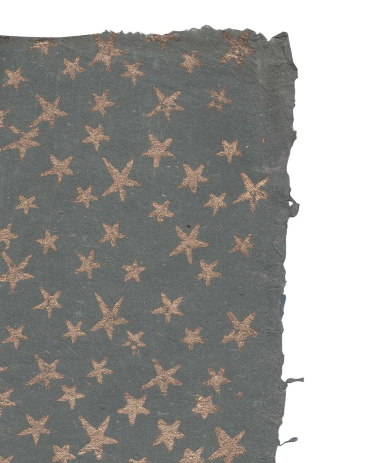 This golden star print on a bark brown paper, is a must have. Ideal for gift wrapping a special gift, or folding it into something creative for children.