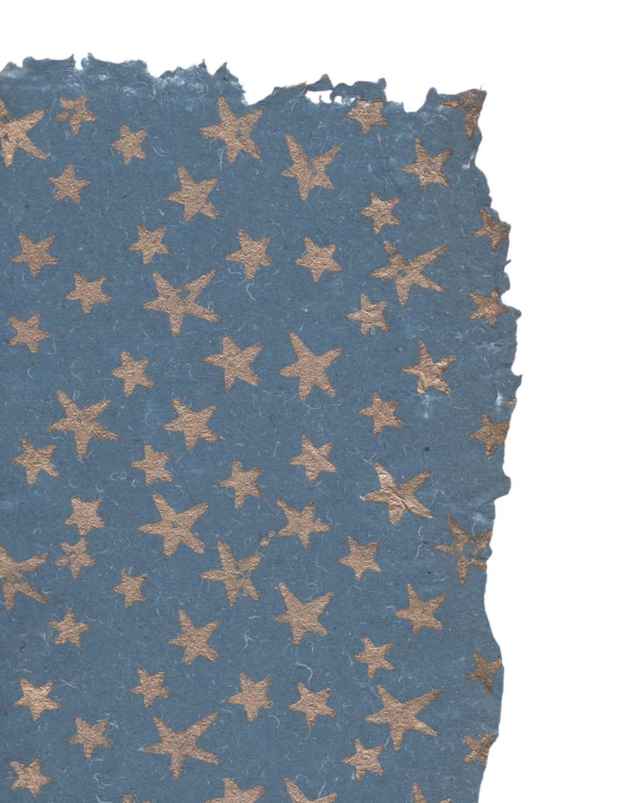 This golden star print on a stone blue paper is a must have. Ideal for gift wrapping a special gift, or folding it into something creative for children.